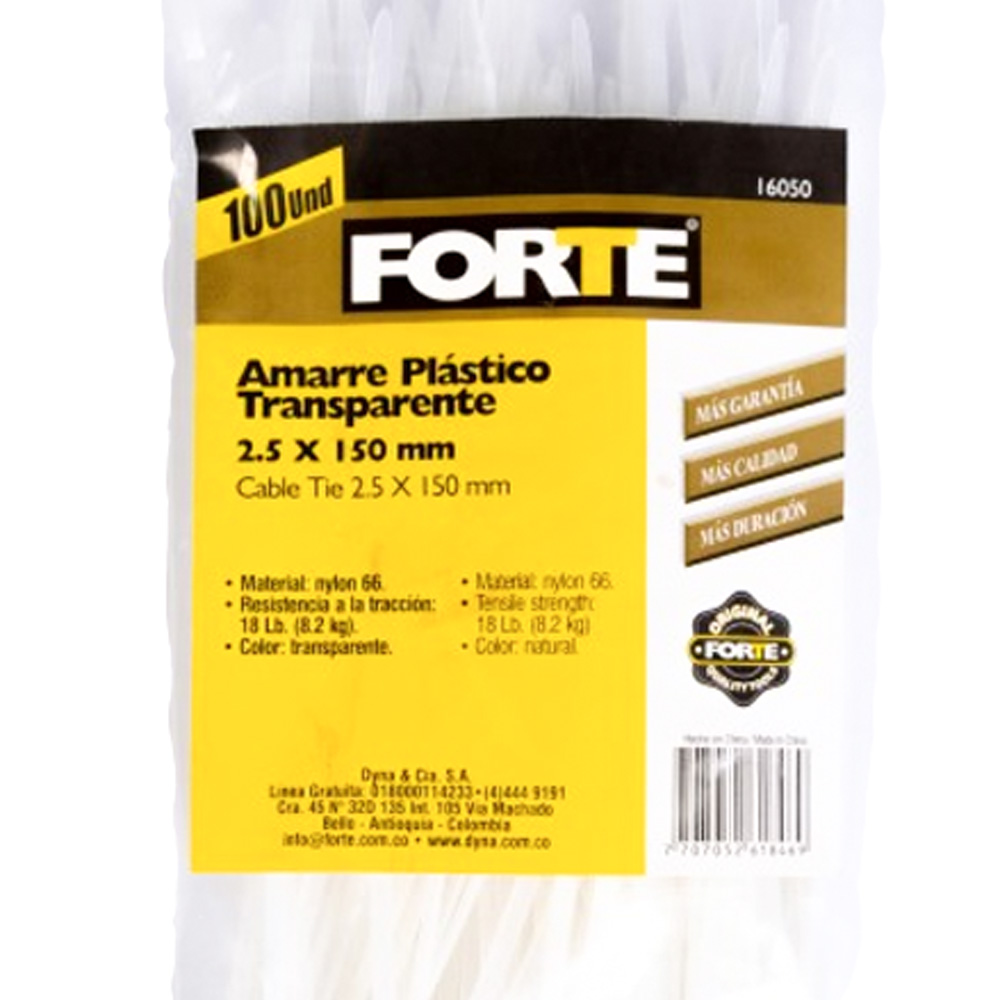Ideal para sujetar y organizar cables.Amarre plastico, material: nylon 66, 100 pcs/ bolsa, tamaño: 2.5 x 150 mm, resistencia a la traccion: 18 lb. (8.2 kg), color: transparente. Empaque x 100 Unidades.
