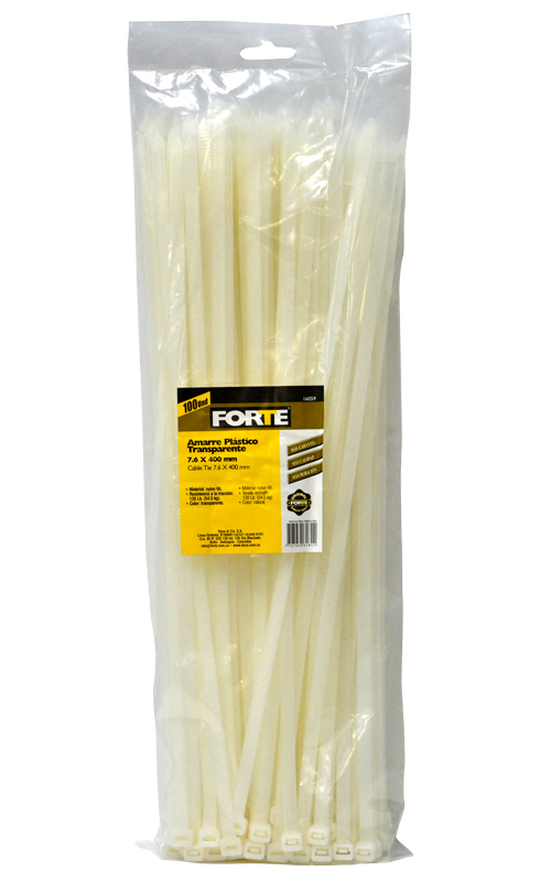 Ideal para sujetar y organizar cables.Amarre plastico, material: nylon 66, 100 pcs/ bolsa, tamaño: 7.6 x 400 mm, resistencia a la traccion: 120 lb. (54.5 kg), color: transparente. Empaque x 100 Unidades.