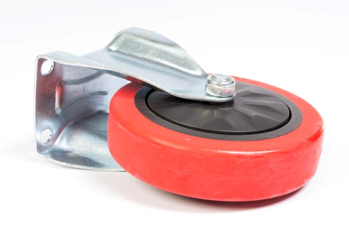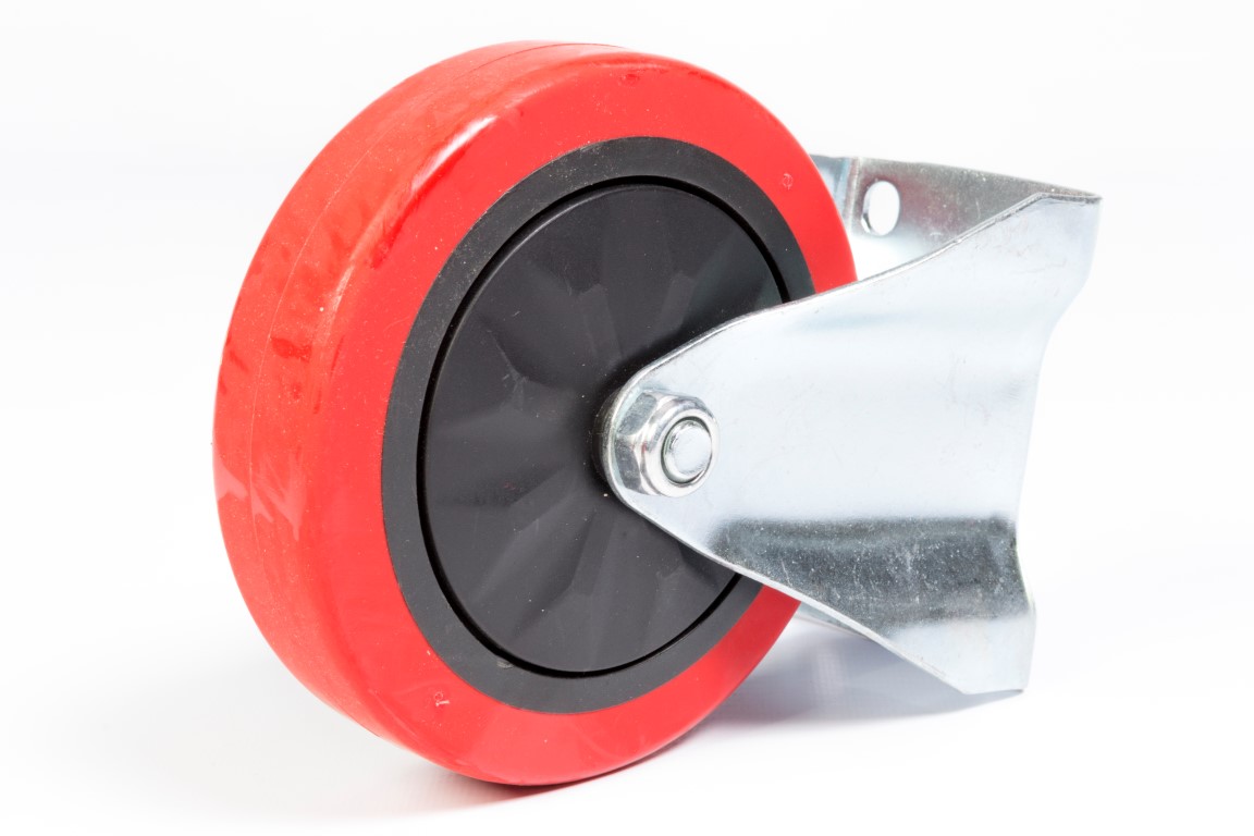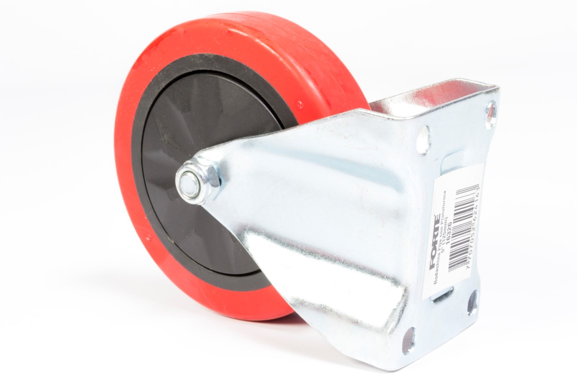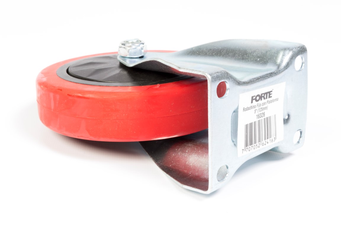 Rodachina fija con plataforma, rueda en poliuretano rojo, usadas en exhibidores de mercancía, carros y plataformas, capacidad de carga 125 kg, 5" (125mm).Estas medidas pueden presentar variaciones. Viene por 6 unidades.