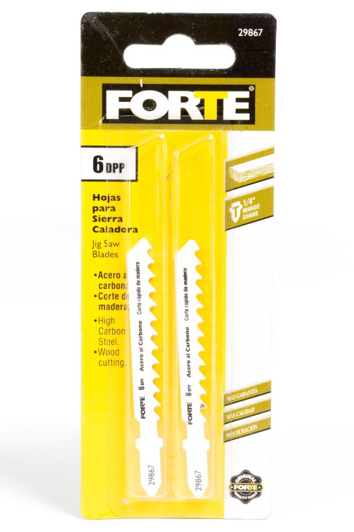 Las hojas FORTE® de acero al carbono para sierra caladora, se pueden usar para cortar maderas duras o suaves así como madera aglomerada. Mientras menos dientes tengan por pulgada, más agresivo y más áspero será el corte. Consulta el sistema de Anclaje de la maquina antes de elegir la hoja.