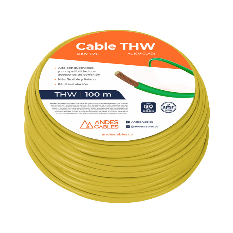 Nuestro Cable THHW es un conductor único (monoconductor) de aluminio recubierto en cobre, aislado con PVC de alta calidad, diseñado para ofrecer máximo desempeño y facilidad de instalación. Voltaje: hasta 600 V - Temperatura máxima: 90 ° Disponible en 6 colores para una instalación organizada: blanco, negro, verde, amarillo, azul y rojo. Presentaciones: Rollos de 100 m o bobinas de 500 m . Cumple la norma RETIE 2024 Alta flexibilidad: formado por varios hilos que facilitan su manipulación y tendido. Más seguro: aislamiento autoextinguible que evita la propagación del fuego. Fácil transporte: rollos y carretes más livianos que reducen esfuerzo y tiempo. Ideal para: instalaciones eléctricas residenciales, comerciales e industriales donde la confiabilidad, seguridad y practicidad son esenciales