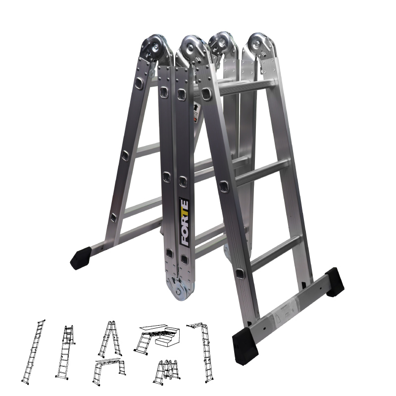 Escalera multifuncional fabricada en aluminio. Posee 4 cuerpos cada uno de 3 peldanos. Capacidad maxima de carga 113 kg, altura total 3,7 mt.