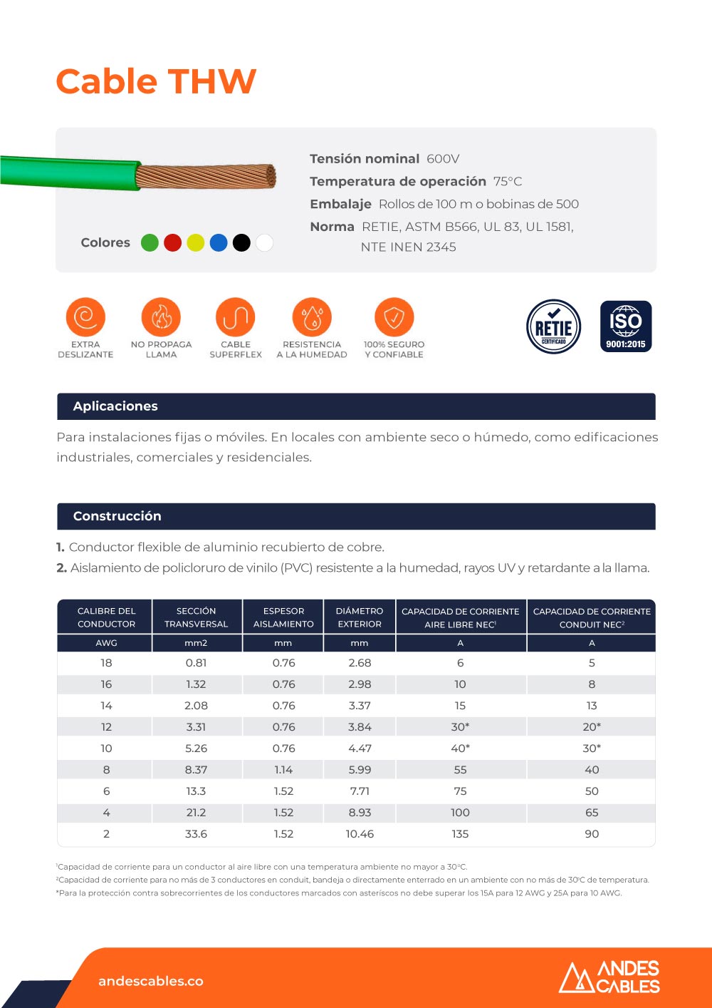 Cable THW Color Negro Tensión nominal 600 V. Temperatura de operación 75ºC, Rollo de 500 Metros