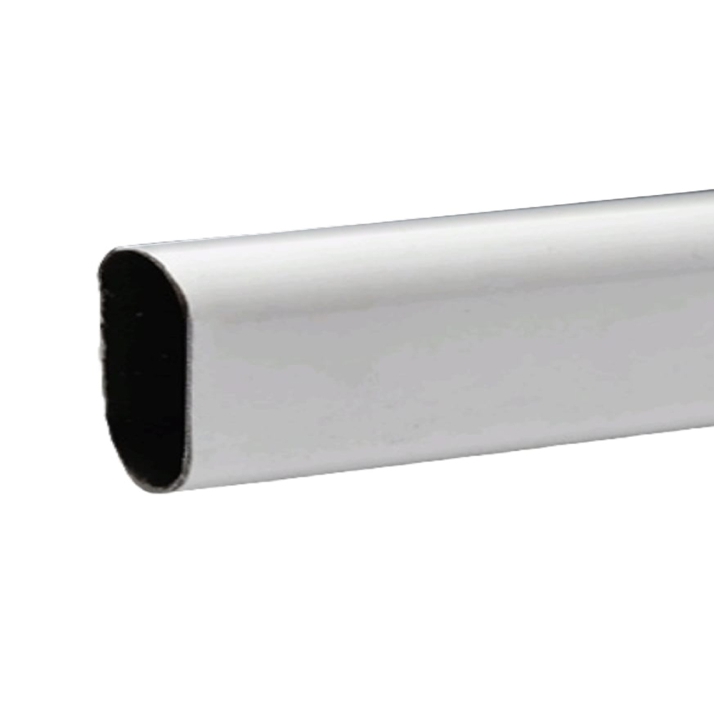 Perfil ovalado en acero, con recubrimiento de pintura electroestatica color blanco, con medidas de 15 x 30 mm, longitud de 3 metros y calibre de 0.6 mm, es un complemento imprescindible para colgar la ropa en los closet, por ser de acero en un calibre delgado es de mediana resistencia a los golpes pero alta resiistencia al peso, posee alto brillo y durabilidad, peso 700 gramos.