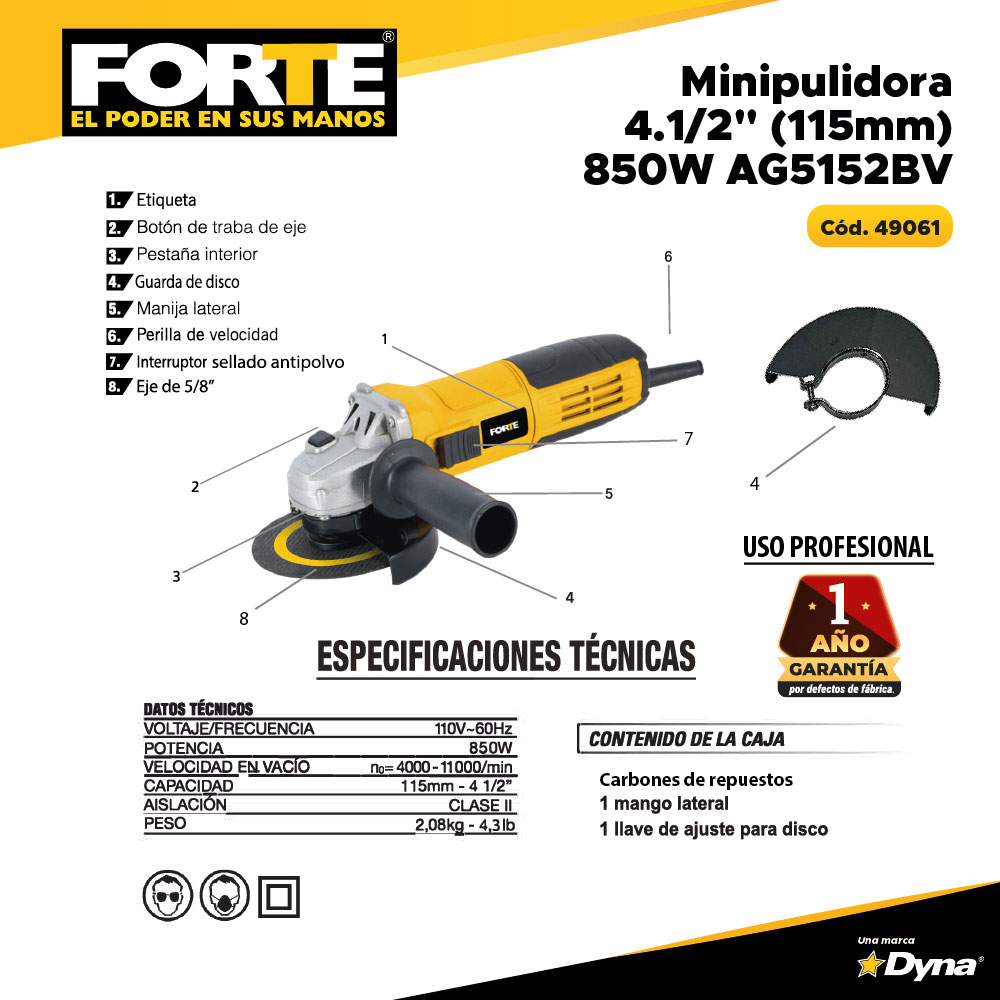 Minipulidora o amoladora Angular de Disco de capacidad de 4.1/2" (115mm). Potente motor de 850W para aplicaciones exigentes. Velocidad 11.000RPM. Con ajuste de velocidad. Peso 2.1 Kg