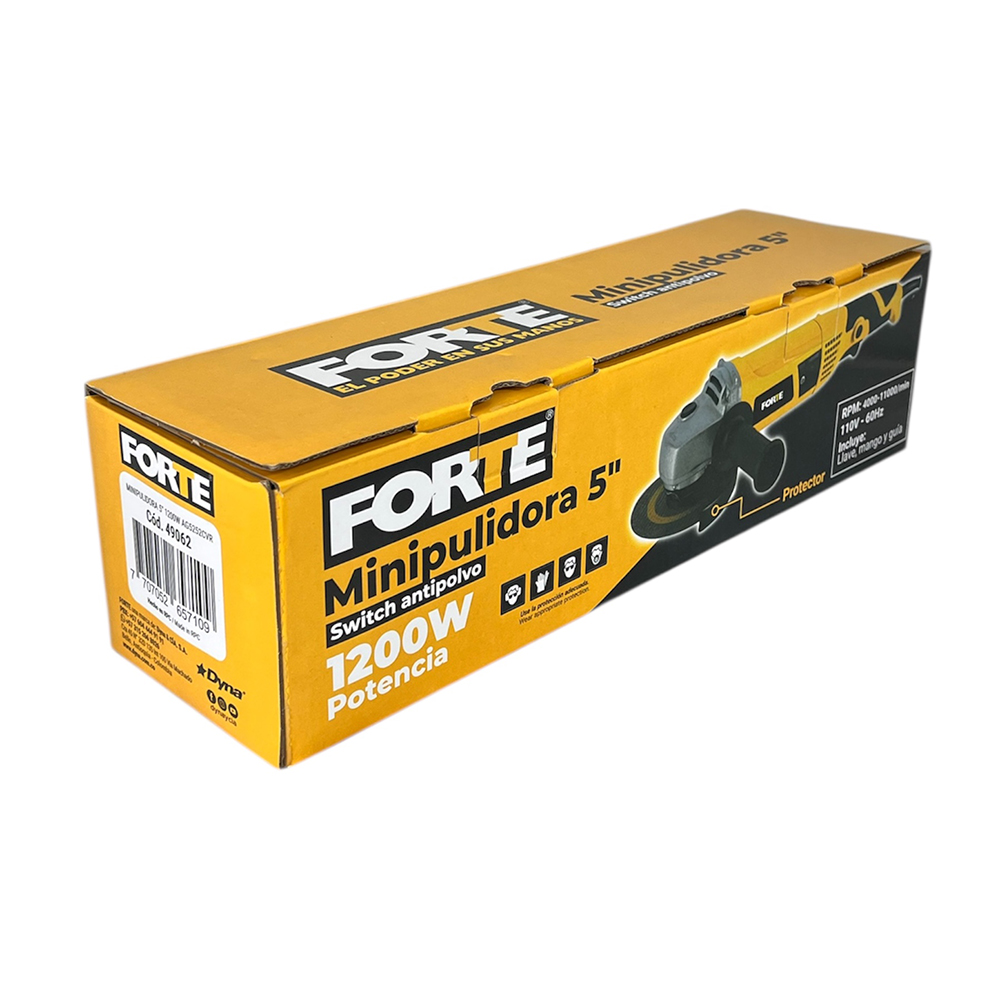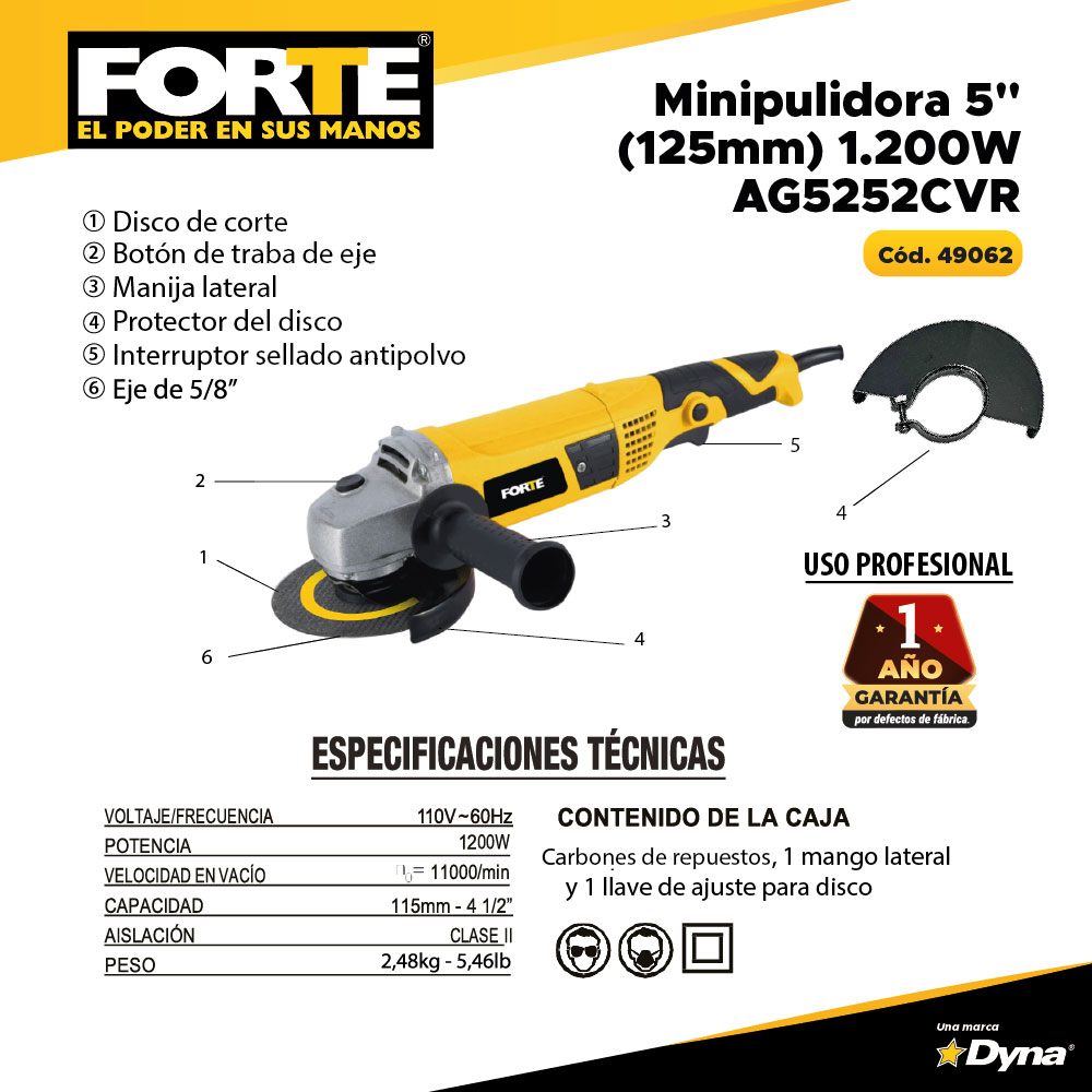 Minipulidora o amoladora Angular de Disco de capacidad de 5" (125mm). Potencia en su motor de 1.200W Velocidad 10.000RPM. Con ajuste de velocidad e interruptor antipolvo. Peso 2.5 Kg
