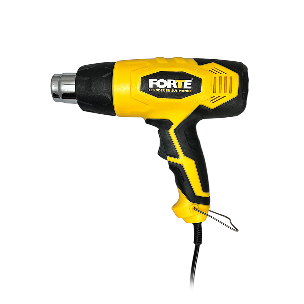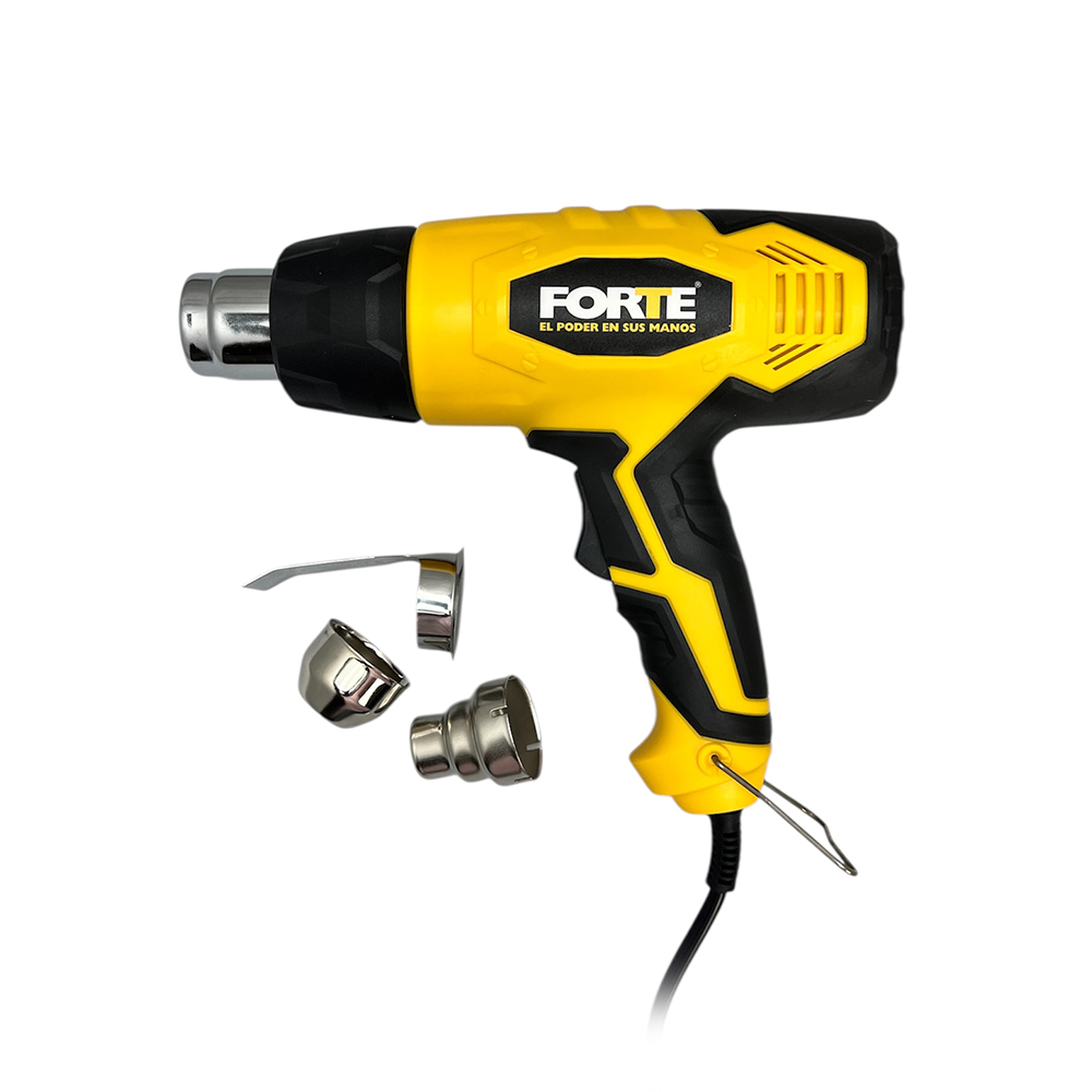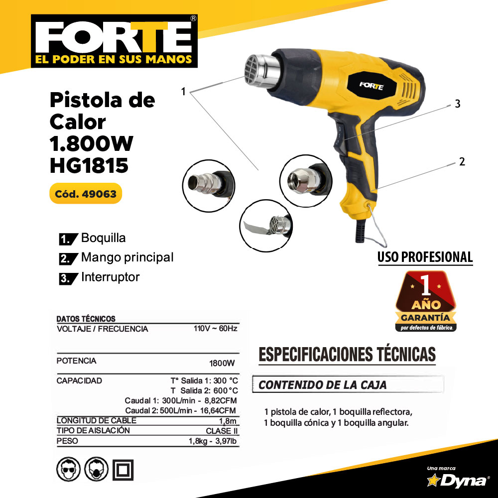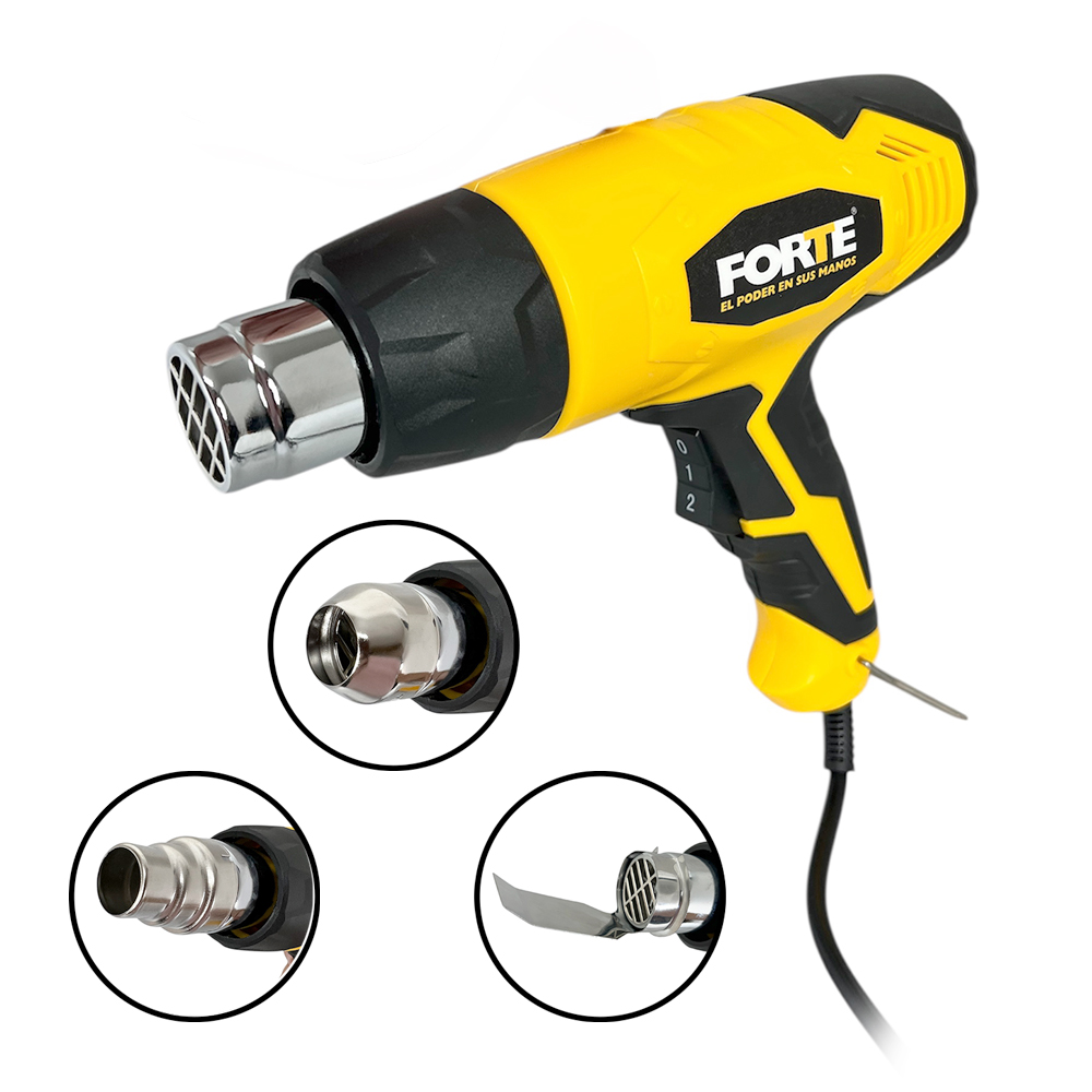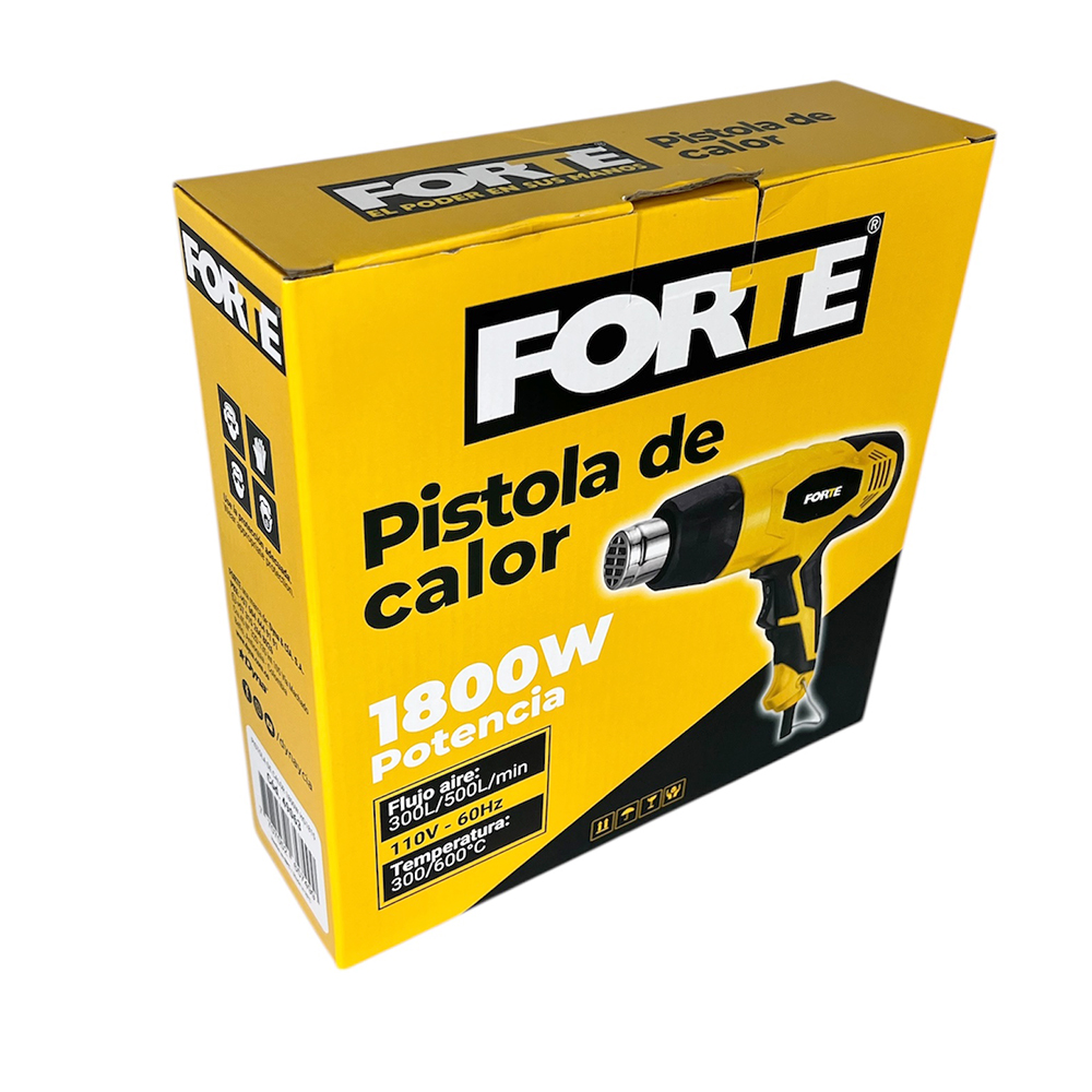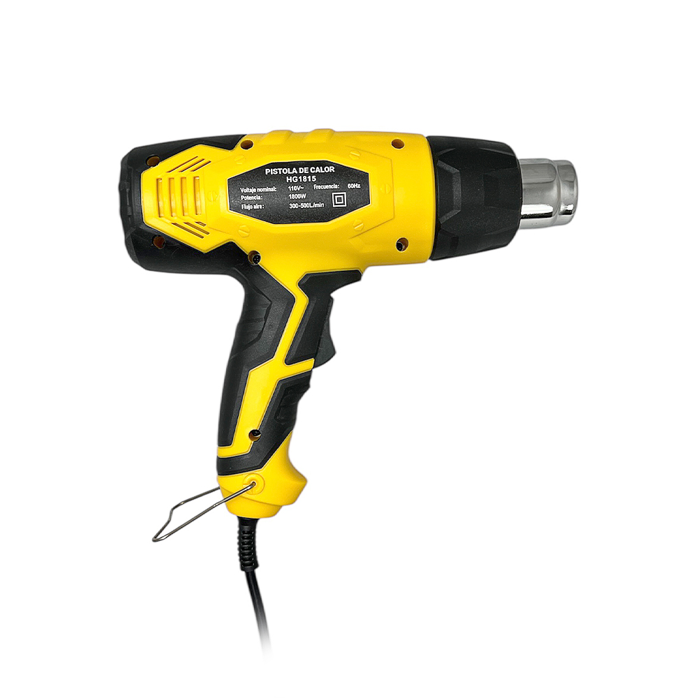 Pistola de Calor 1.800W. Temperatura de salida 300°C y 600°C. Caudal de Salida: 300 litros por minuto y 500 litros por minuto. Peso 1.2 Kg