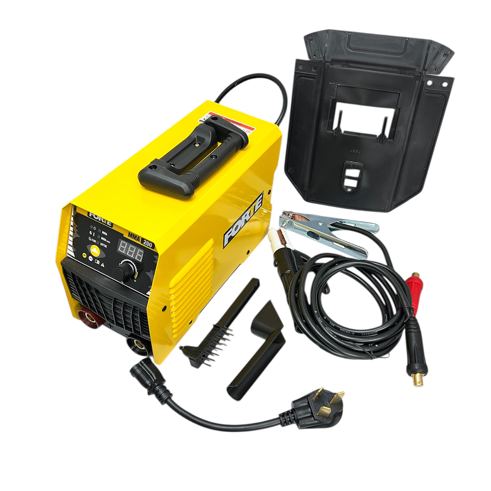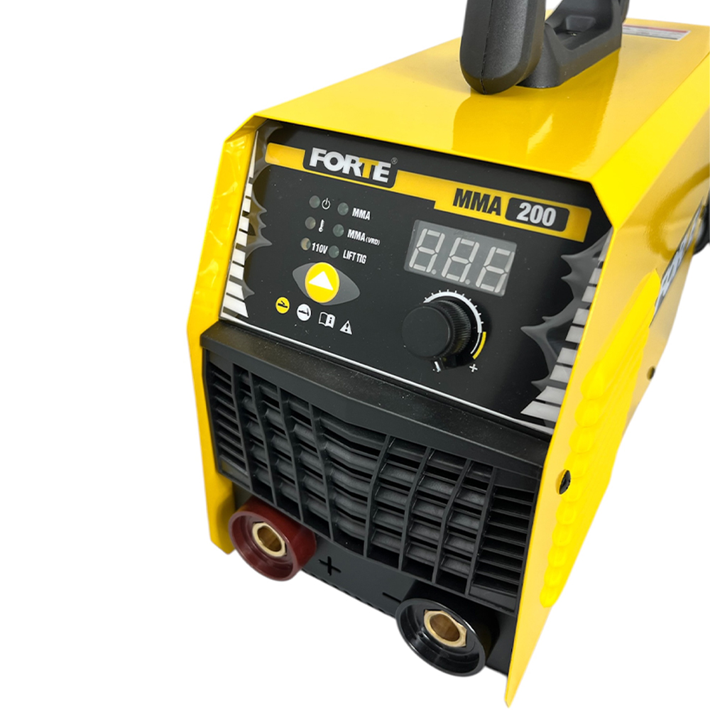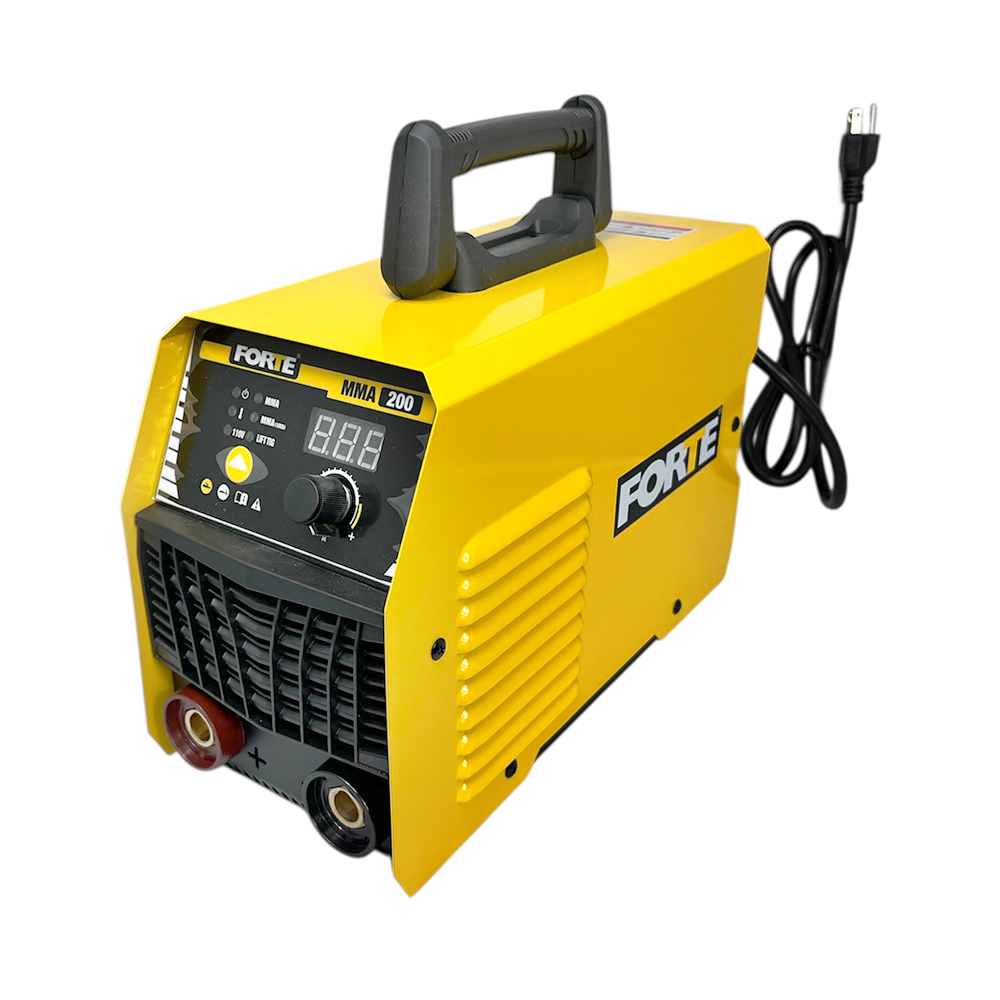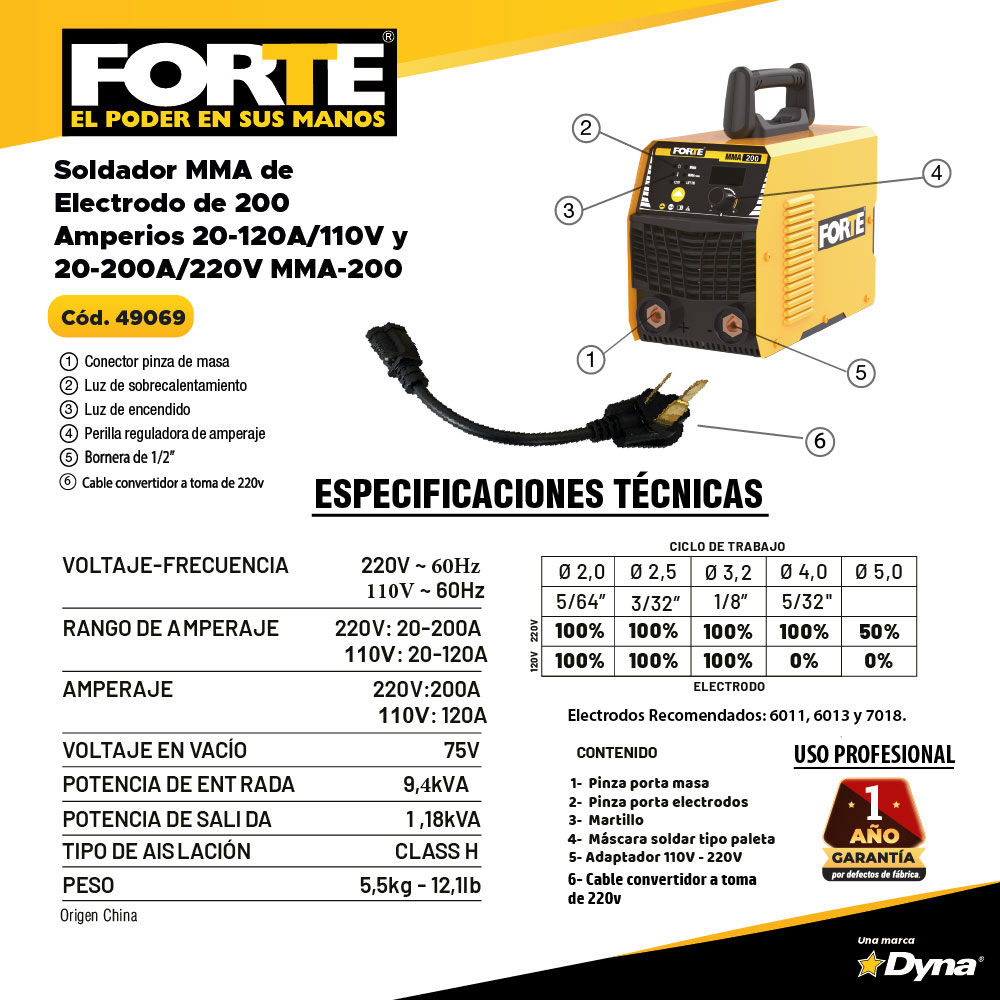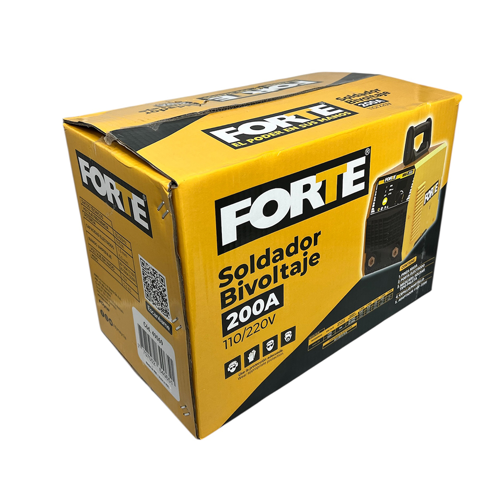 Soldador Inverter Bivoltaje para proceso de soldadura con electrodo. Potencia de 9.4KVA. Diámetro de Electrodo: 5/64"a 1/8"mm-110V y 5/64" a 5/32"-220V en Celulósicos E6011, Rutílicos E6013 y básicos E7018. Rango de Amperaje: 20-120A/110V 20-200A/220V. Bivoltaje 110/220V de selección automática y panel digital. Peso 7.5 Kg. Incluye: Pinza masa + Portaelectrodo+ Mascara plegable + Cepillo Martillo