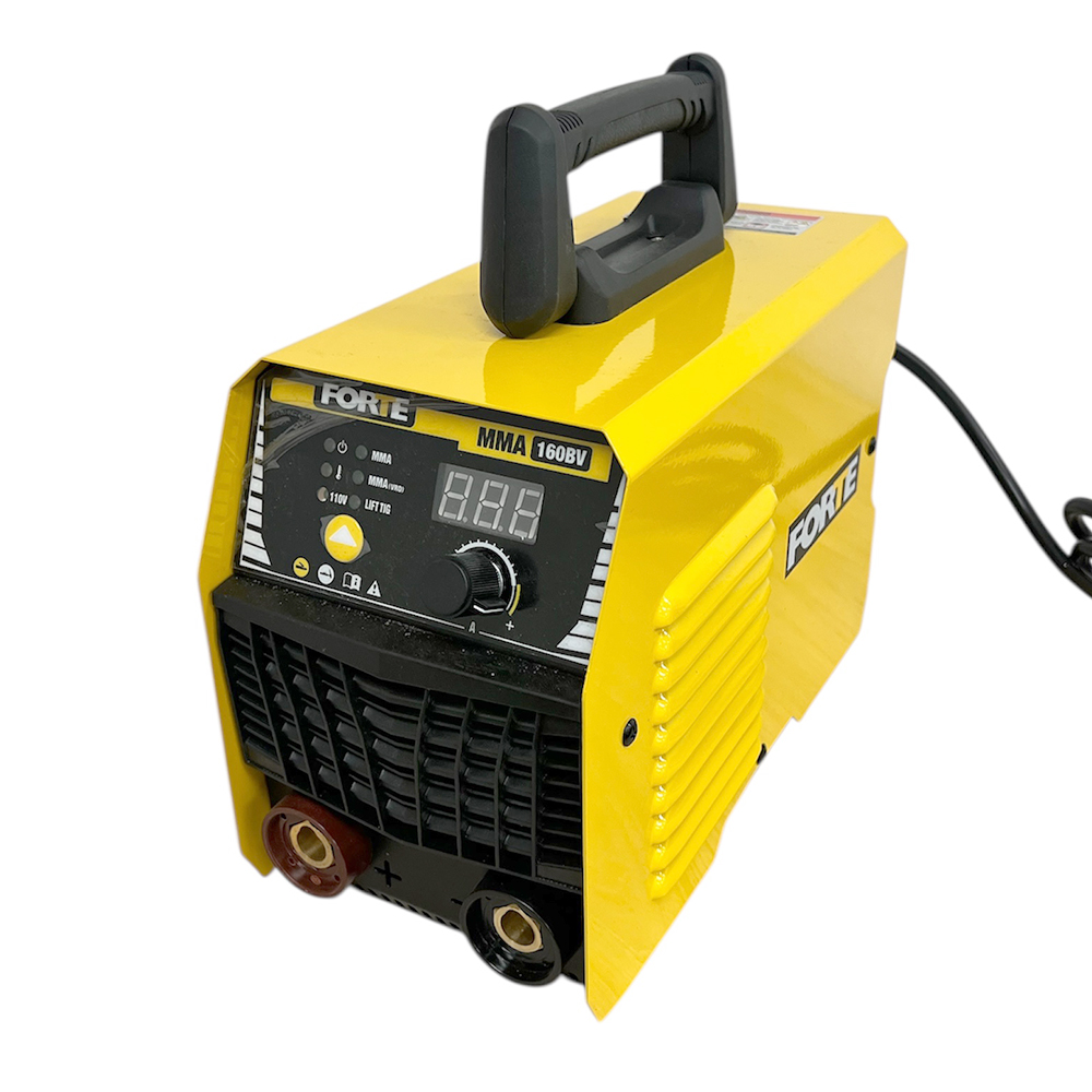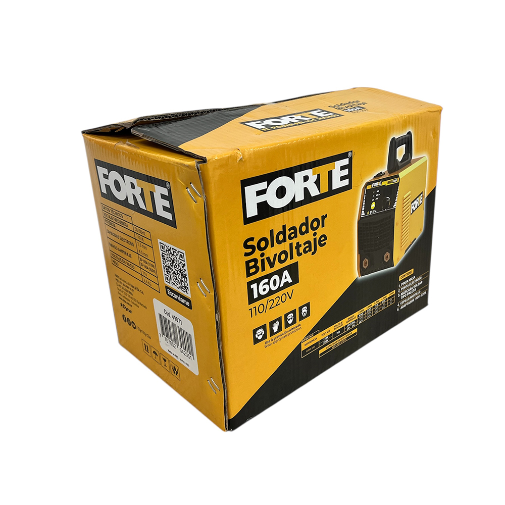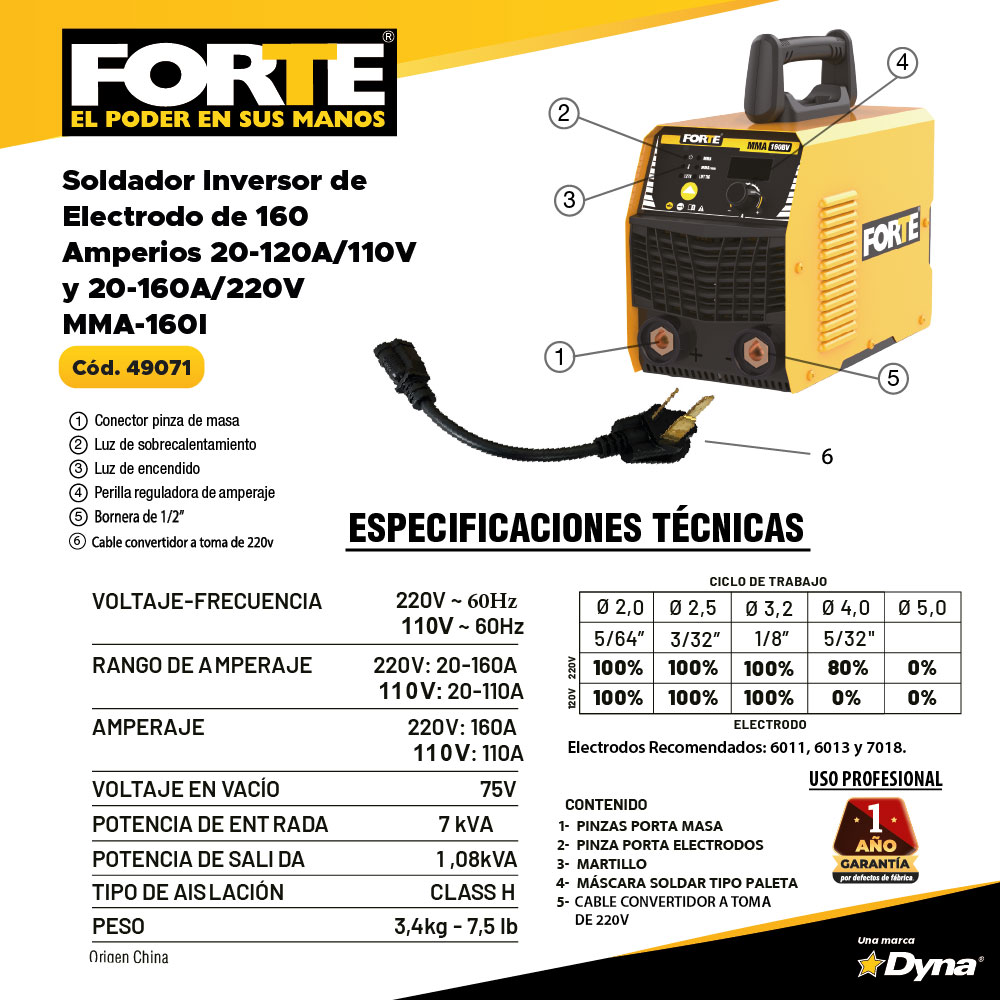 Soldador Bivoltaje para proceso de soldadura con electrodo. Potencia de 7 KVA. Diámetro de Electrodo: 5/64"a 1/8"mm-110V y 5/64" a 5/32"-220V en Celulósicos E6011, Rutílicos E6013 y básicos E7018. Rango de Amperaje: 20-120A/110V 20-160A/220V. Peso 5.4 Kg. Incluye: Pinza masa + Portaelectrodo+ Mascara plegable + Cepillo Martillo
