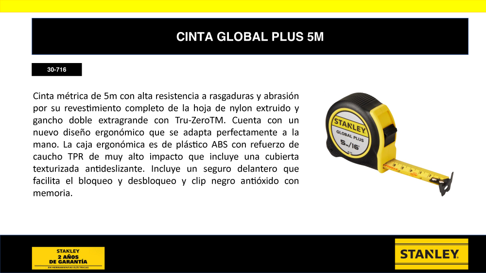Cinta métrica de 5m con alta resistencia a rasgaduras y abrasión por su revestimiento completo de la hoja de nylon extruido y gancho doble extragrande con Tru-ZeroTM. Cuenta con un nuevo diseño ergonómico que se adapta perfectamente a la mano. La caja ergonómica es de plástico ABS con refuerzo de caucho TPR de muy alto impacto que incluye una cubierta texturizada antideslizante. Incluye un seguro delantero que facilita el bloqueo y desbloqueo y clip negro antióxido con memoria.