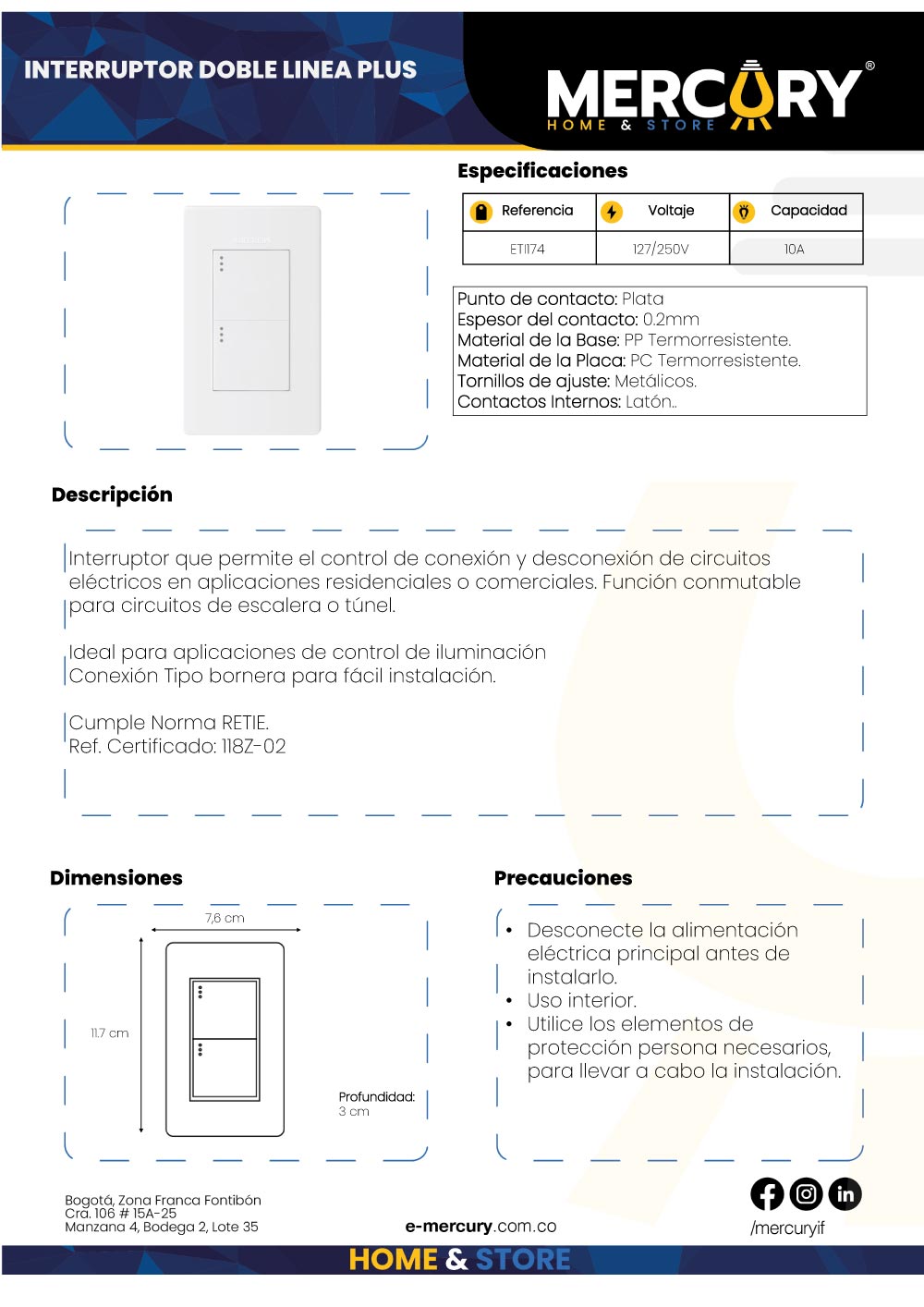 Interruptor que permite el control de conexión y desconexión de circuitos eléctricos. Punto de contacto: Plata, Espesor del contacto: 0.2mm, Material de la Base: PP Termorresistente ,Material de la Placa: PC Termorresistente, Tornillos de ajuste: Metálicos, Contactos Internos: Latón, Voltaje: 127/250V, Capacidad: 10A