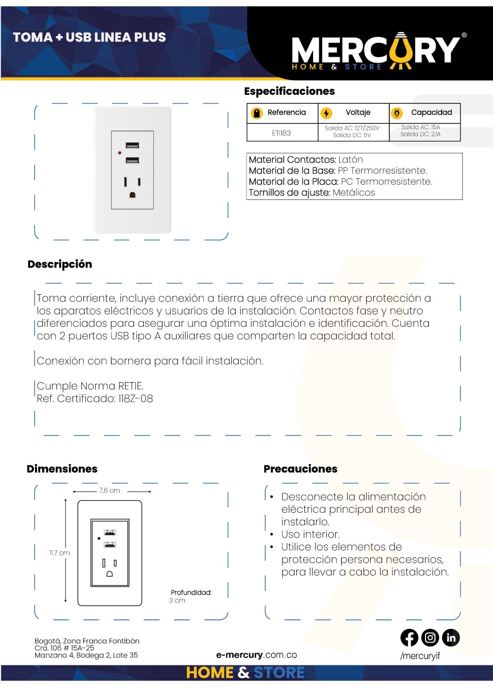 Toma corriente, incluye conexión a tierra que ofrece una mayor protección a los aparatos eléctricos y usuarios de la instalación. Contactos fase y neutro diferenciados para asegurar una óptima instalación e identificación. Cuenta con 2 puertos USB TIPOA + TIPO C auxiliares que comparten la capacidad total. Conexión con bornera para fácil instalación.Cumple Norma RETIE. Ref. Certificado: 118Z-08Material Contactos: Latón Material de la Base: PP Termorresistente. Material de la Placa: PC Termorresistente. Tornillos de ajuste: Metálicos 120° Luz BlancaVoltaje Salida AC: 127/250V_ Salida DC: 5VCapacidad Salida AC: 15ª_ Salida DC: 2.1A.