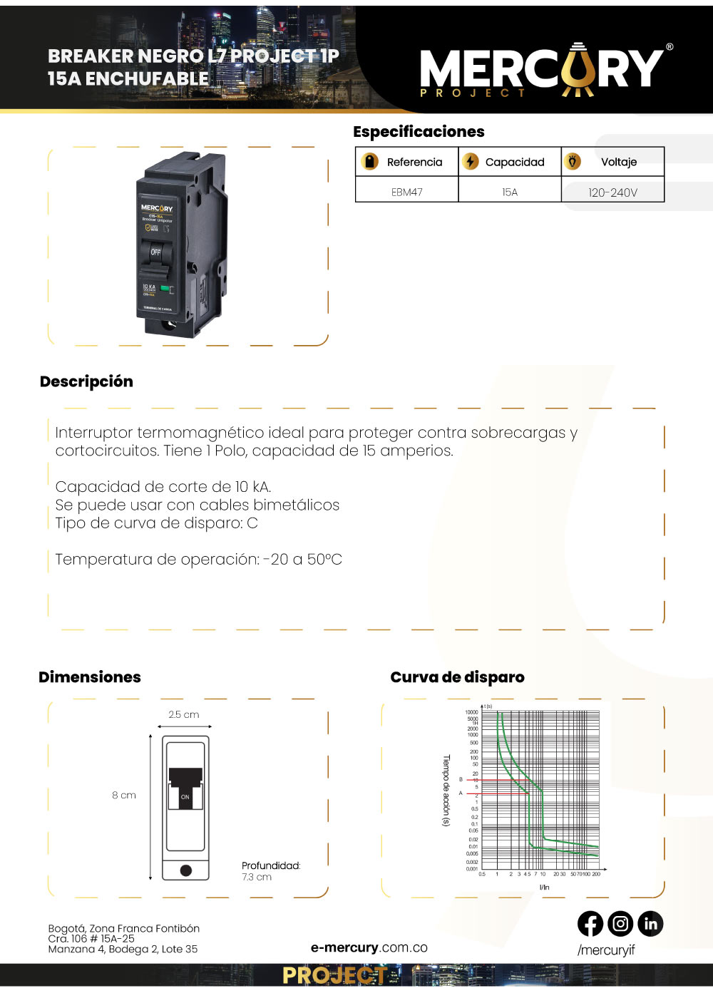 Interruptor termomagnético ideal para proteger contra sobrecargas y cortocircuitos. Tiene 1 Polo, capacidad de 15 amperios. Capacidad de corte de 10 kA. De uso exclusivo para cables de cobre_ Tipo de curva de disparo: C _Temperatura de operación: -20 a 50°C