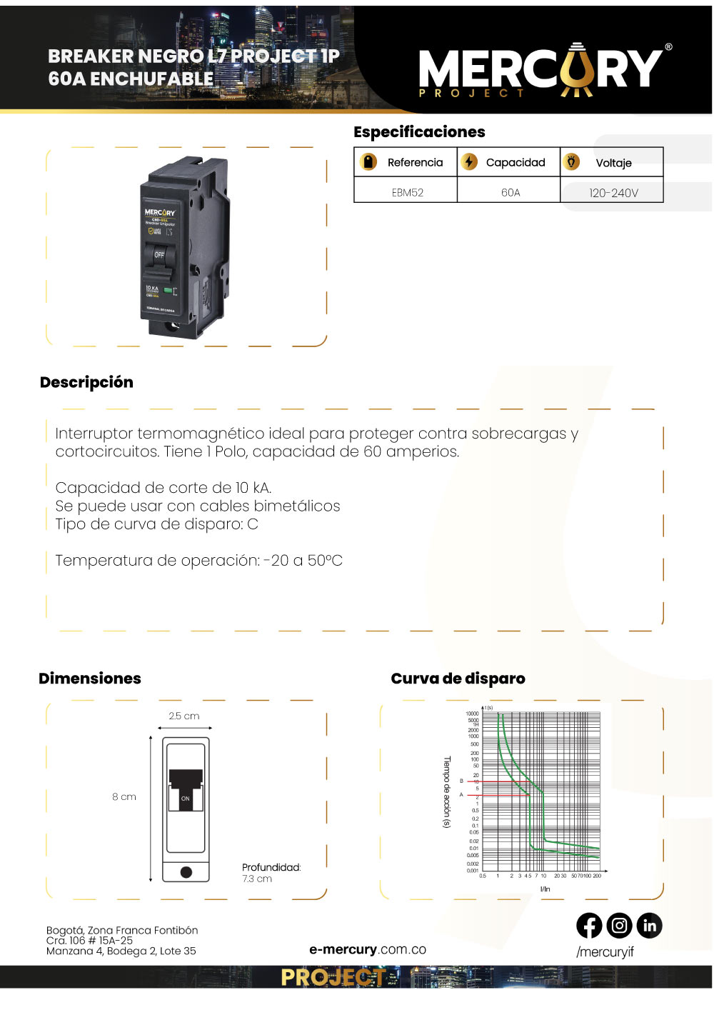 Interruptor termomagnético ideal para proteger contra sobrecargas y cortocircuitos. Tiene 1 Polo, capacidad de 60 amperios. Capacidad de corte de 10 kA. De uso exclusivo para cables de cobre_ Tipo de curva de disparo: C _Temperatura de operación: -20 a 50°C