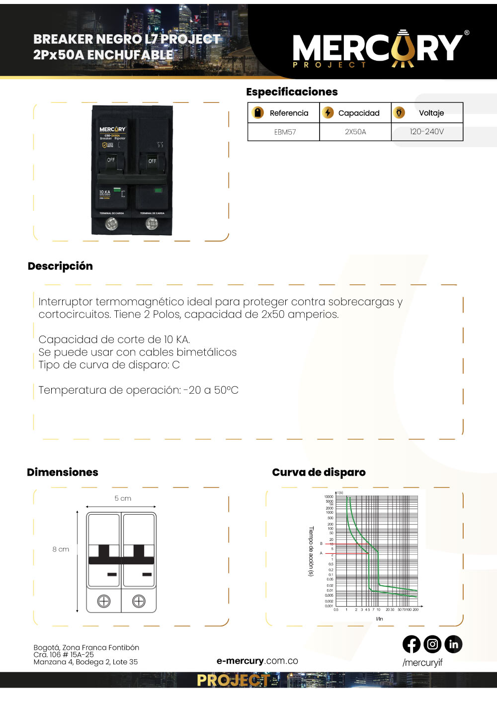 Interruptor termomagnético ideal para proteger contra sobrecargas y cortocircuitos. Tiene 2 Polos, capacidad de 50 Amperios. Capacidad de corte de 10 kA. De uso exclusivo para cables de cobre_ Tipo de curva de disparo: C _Temperatura de operación: -20 a 50°C