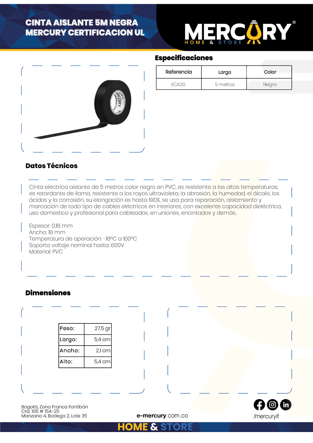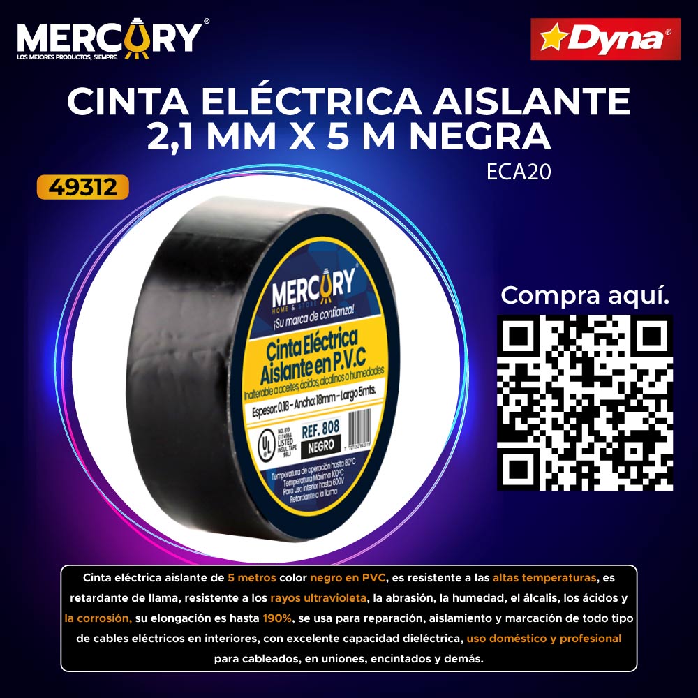 Cinta eléctrica aislante de 5 metros color negro en PVC, es resistente a las altas temperaturas, es retardante de llama, resistente a los rayos ultravioleta, la abrasión, la humedad, el álcalis, los ácidos y la corrosión, su elongación es hasta 190%, se usa para reparación, aislamiento y marcación de todo tipo de cables eléctricos en interiores, con excelente capacidad dieléctrica, uso doméstico y profesional para cableados, en uniones, encintados y demás.