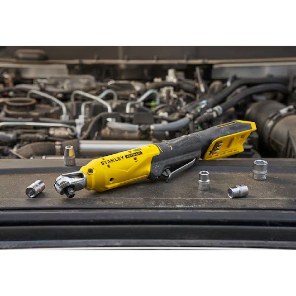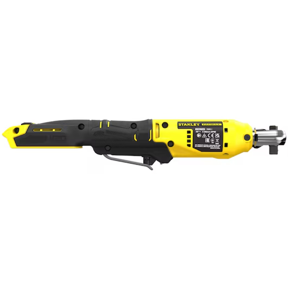 Ratchet / matraca inalámbrico del sistema 20v fatmax con control de avance y reversa fácilmente accesible. Control de velocidad variable para menos riesgo de apriete excesivo. Compacta para trabajos de difícil acceso. Luz led que mejora visibilidad en el área de trabajo. Cuadrante de 3/8” con pasador de retención. Torque 47nm. Velocidad máxima 0 - 300rpm. Este producto se vende si cargador ni baterías.