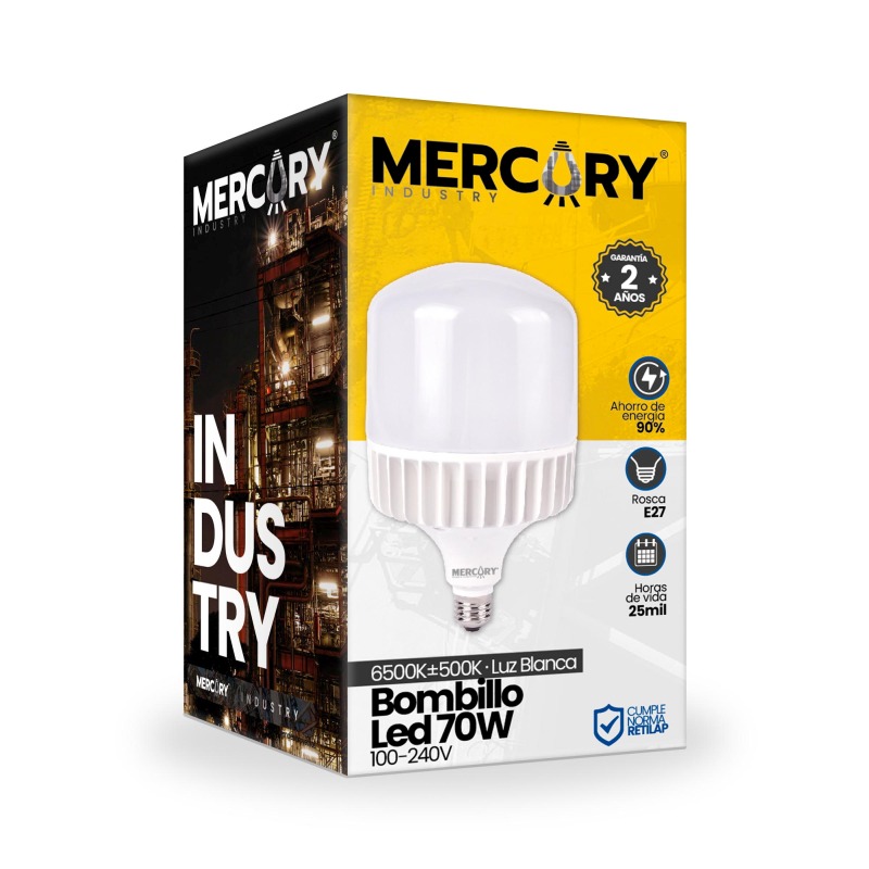 Voltaje: 85-265V Vatios: 70W Color luz blanca, Lumenes: 6300 LM/W Proteccion IP: 20 Horas de vida: 25.000