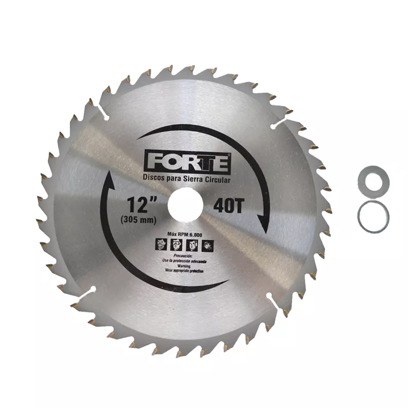 Cuerpo fabricado en acero al carbono para mayor resistencia. Diente con pastilla de tungsteno para mayor dureza y rendimiento en el corte. Pastilla de tungsteno soldada por láser que evita el desprendimiento en el momento de operación. Se utiliza para corte de madera. Diámetro 12pg, # de dientes 40, Eje 30 mm * con bujes 1pg (25 mm) y 5/8pg (16 mm). Empaque blíster individual con bujes incluidos.